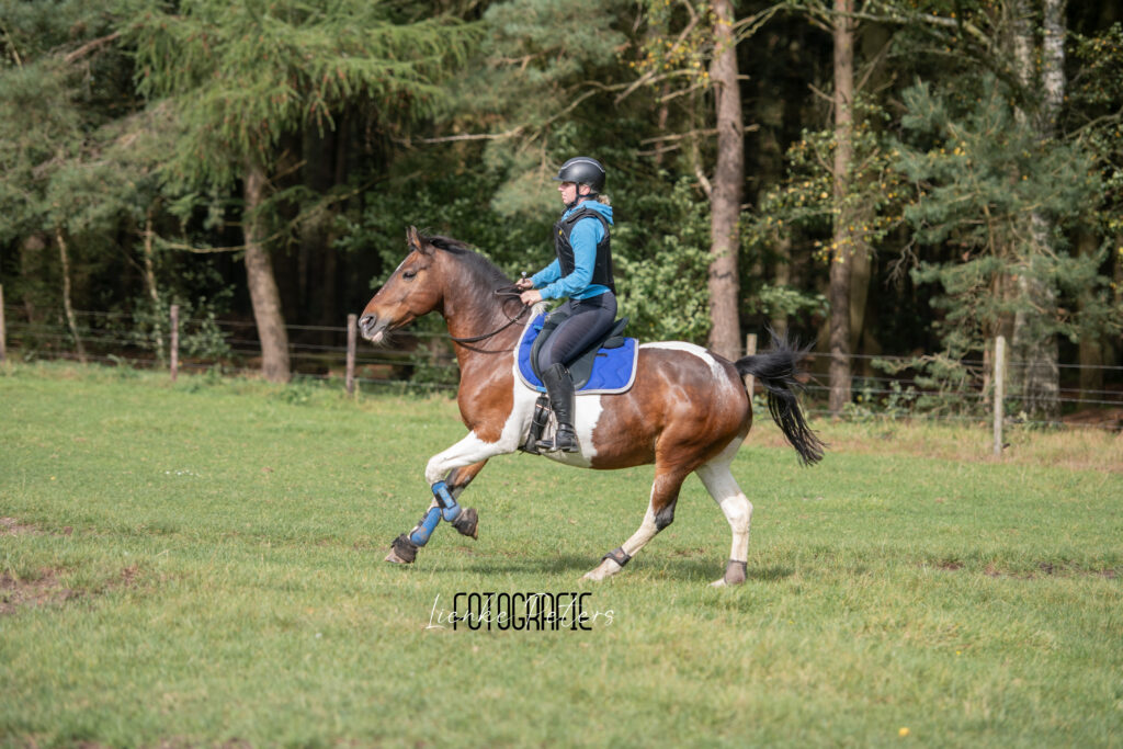 - Houd in het begin nog een touwhalster om. indien nodig kun je het halster pakken en het paard in een ‘one rein stop’ zetten.